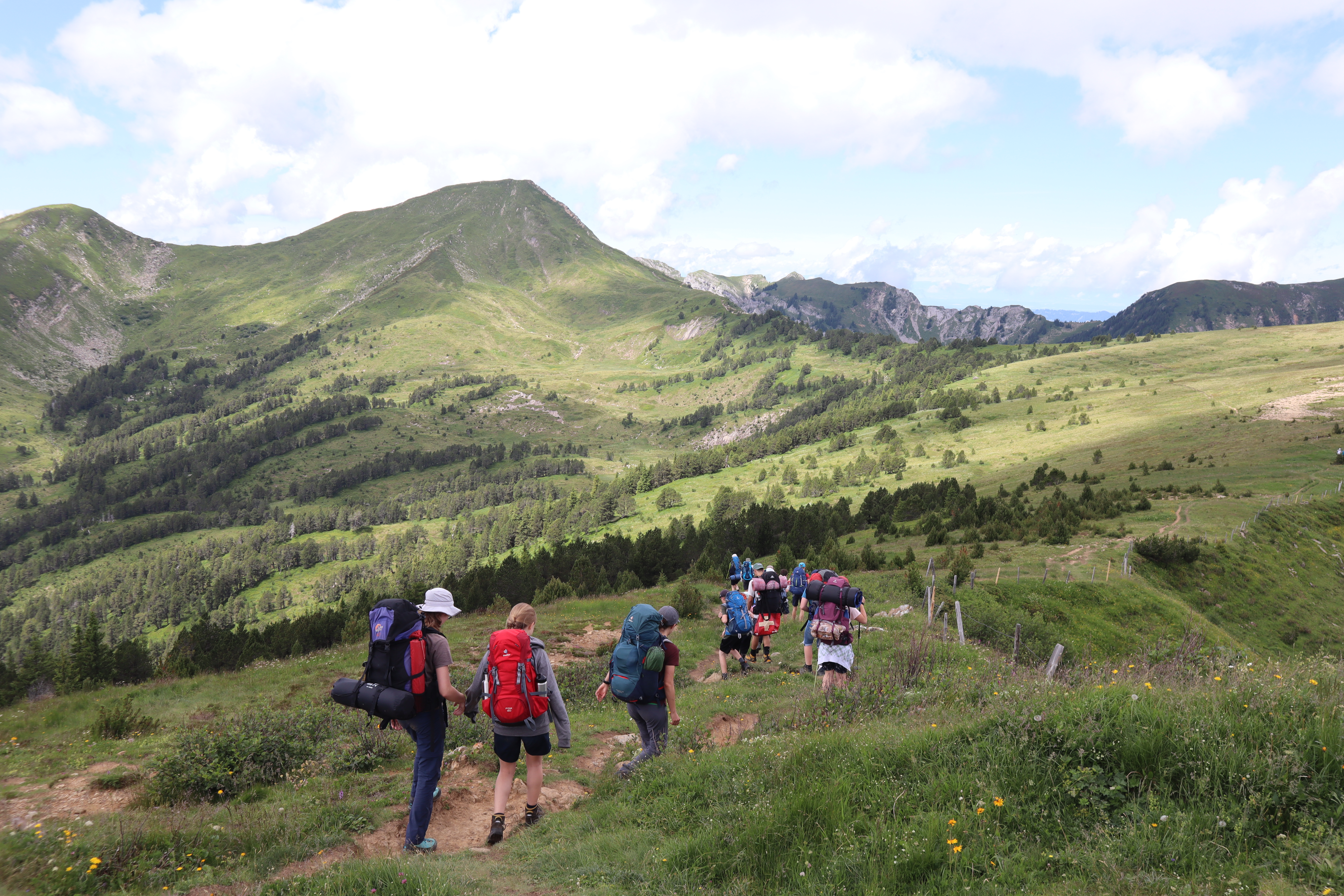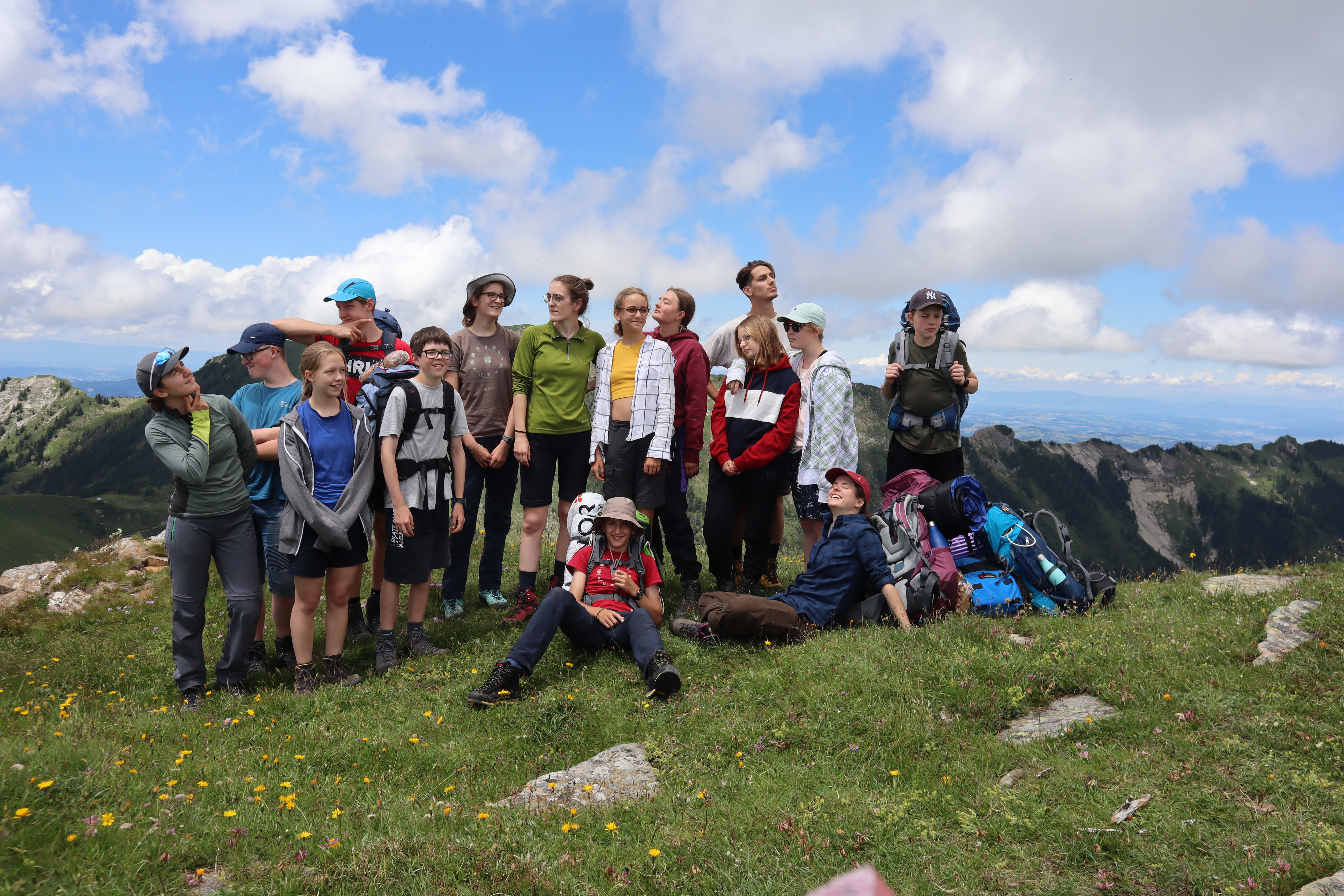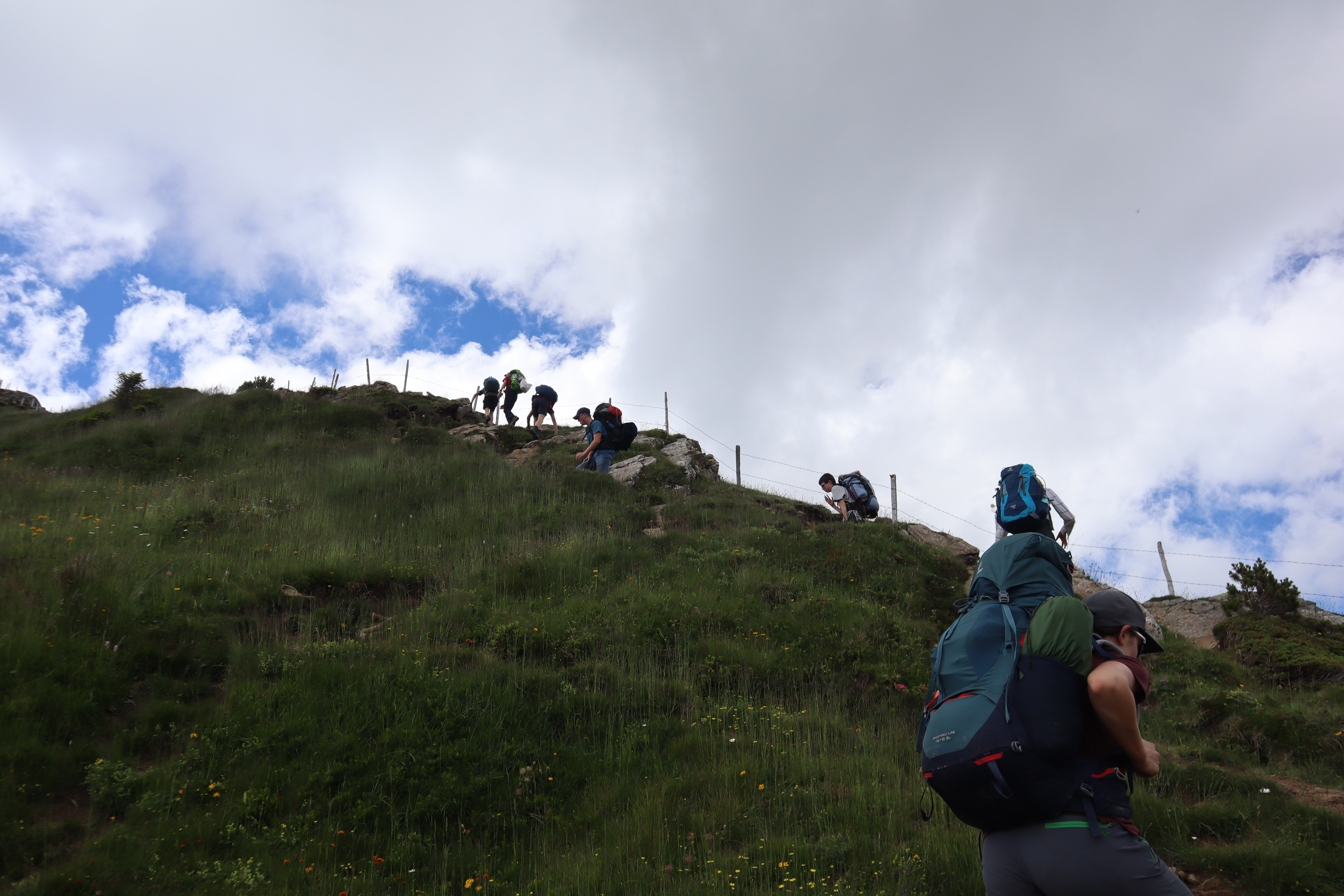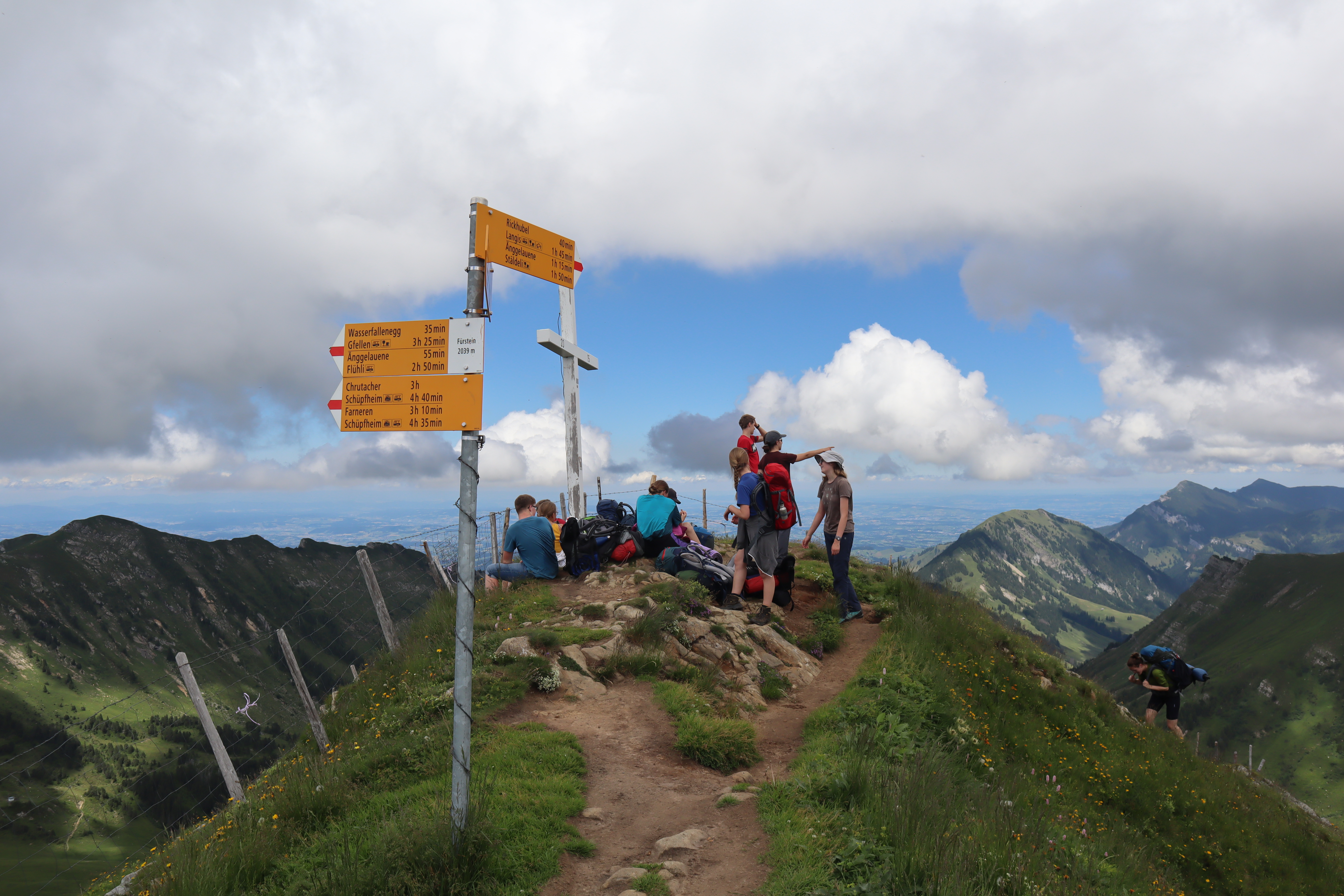 Am ersten Tag sind wir um ca. 10:15 Uhr gestartet. Wir sind als erstes steil den Hang hinauf, über die Baumgrenze auf 1942 m.ü.M. Oben angekommen erwartete uns ein atemberaubender Ausblick über die Alpen und ins Flachland. Dort gab es eine Znünipause. Wir liefen dann weiter über ein Plateau. Ganz vorne angelangt, kurz vor dem Abgrund, assen wir unser Mittagessen und machten einfach eine kleine entspannte Pause. Danach ging es sehr steil auf einem Grat den Berg hoch. Leute mit schwerem Rucksack hatten zu krampfen und schwitzen.
